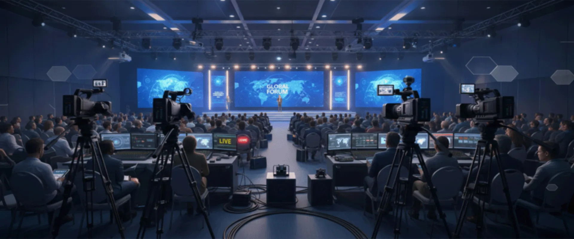 A Technical Director ensures smooth technical operations during your event — checking that cameras are working properly, audio levels are good, and the video feed is displaying correctly on the LED wall.